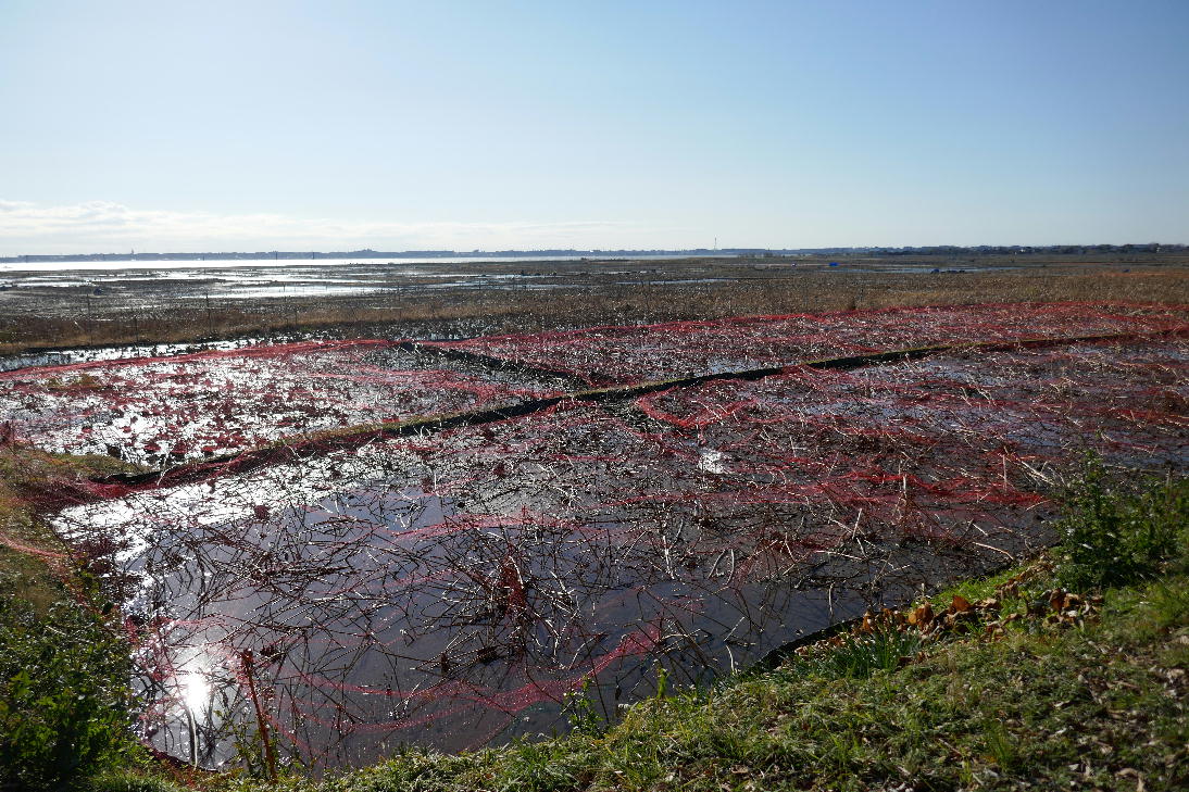 霞ケ浦は見渡す限りレンコン田だらけ。そしてネット(網)が唯一の迷惑鳥防止対策と従来考えられていたようです。もちろんネットはかなり有効なようですが完ぺきではないようです。いろいろ問題が起きているようです。まず第一に鳥が引っ掛かって死んでしまう。時期によればたくさんぶら下がって死んでいます。愛鳥保護団体からの猛反発を食らっているそうです。ORSAレーザーは鳥にも安全な光ネットですね。通信網のネットではなく、本当の網という意味での光ネット。防鳥光ネットですね。防獣光ネットもあります。