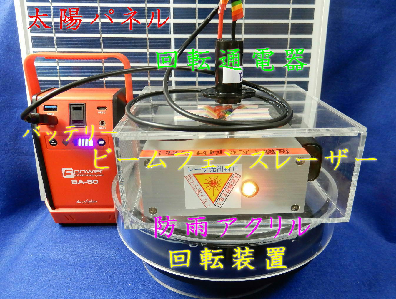 通常の100Vコンセントや自動車のプラグのみならず太陽パネルで昼間充電出来るバッテリーも用意しています。太陽光で昼間充電して夕方暗くなると回転しながらレーザーを点灯させることが自動で出来ます。少なくとも一週間ぐらいは何もしないで自動で動かすことが出来ます。